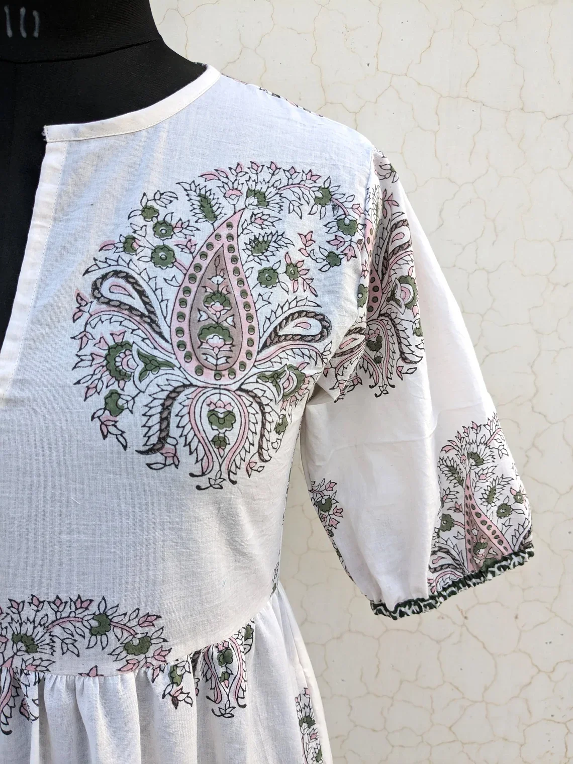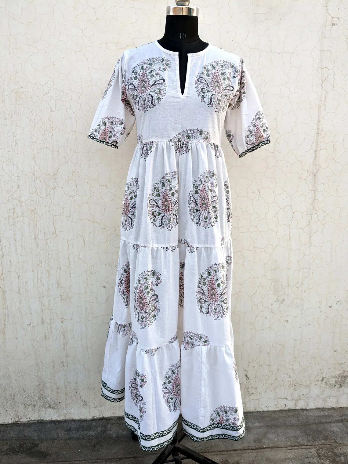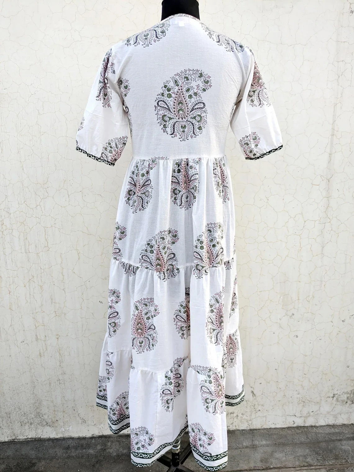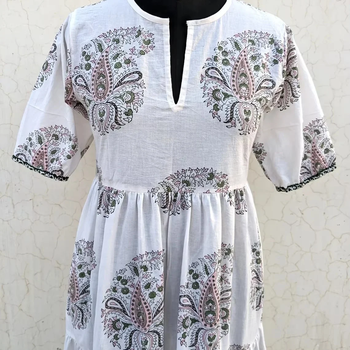 Hand Block Printed Boho Short Dress Summer Cotton Dress V-neck Short Sleeve Floral Print Casual Long Maxi Dress For Women